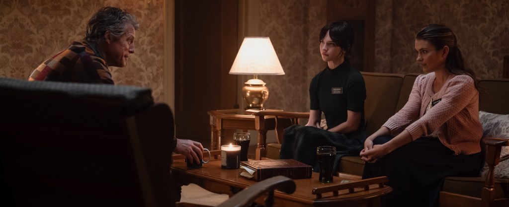 Right off the bat, one of the things I most admired about Heretic is how it treats its lead characters. Mormons are often the punchline of a joke in most films, but Heretic makes it clear from the moment the film begins that the filmmakers care about these characters and that we’re not here to merely laugh at them and their beliefs; they are sincere, fully-rounded characters. Sophie Thatcher and Chloe East both serve up fantastic performances and share really solid, believable chemistry with one-another from the get-go. However, this is really Hugh Grant’s show as he gives an all-time great performance and serves as a perfect foil for our two leads.
